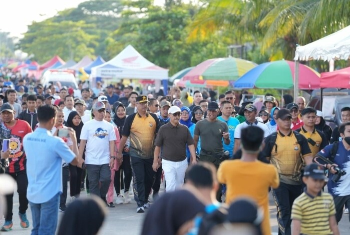 sorotcelebes.com | MAMUJU — Dalam rangka menyemarakkan Hari Jadi Provinsi Sulawesi Barat ke-21, Gubernur Sulbar, Suhardi Duka bersama masyarakat mengikuti jalan santai dari Anjungan Pantai Manakarra hingga Jalan Arteri, Mamuju, Minggu pagi, 21 September 2025.