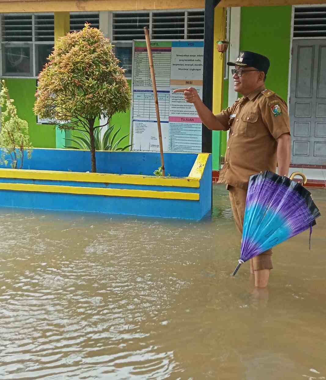 Kepala Desa Tinambung, Adriansyah Djohan, turun langsung menyusuri titik-titik banjir pada Selasa, 24 Februari 2026. Ia memantau ketinggian air yang menggenangi fasilitas pendidikan tersebut sekaligus memastikan kondisi warga yang terdampak.