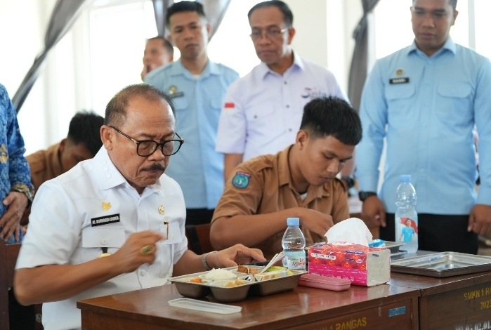 Dalam kesempatan tersebut, Gubernur bahkan mencicipi langsung makanan MBG untuk memastikan kualitas dan kebersihannya bersama para siswa.